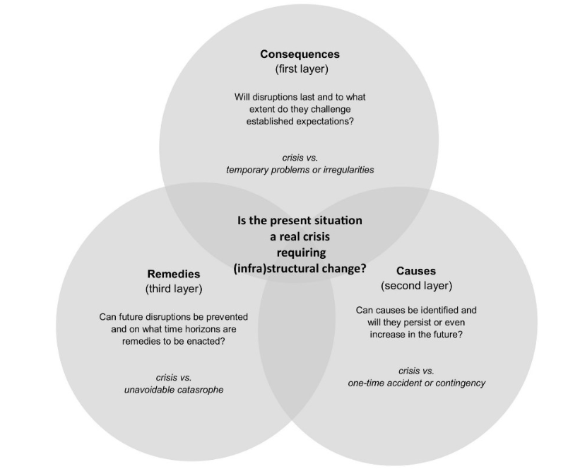 The oil crisis of 1973/74 is commonly seen as the advent of state-led attempts to restructure rich societies’ energy infrastructures. Indeed, from a historical perspective, crises have repeatedly facilitated infrastructural transformations toward sustainability. But under what conditions can crises challenge existing orders and promote alternative infrastructures? Drawing on a historical vignette that reconstructs the public discourse emerging around the first oil crisis in the United States, this article proposes to reconsider the transformative potential of crises from a perspective focusing on the contested constitution of the future. We argue that the potential of crises to foster broader processes of infrastructural change is dependent on the capacity of actors to discursively challenge hopes and expectations inscribed in established infrastructures. As the example of the first oil crisis illustrates, crises are instances in which political actors engage in interpretative struggles to settle on whether disruptions present ‘real’ crises that require infrastructural transformation - or are mere accidents, errors, or irregularities that existent infrastructure can either withstand or requires only minor adaption as a result. In these discursive struggles, images of the future are contested on three layers: tangible experiences are linked to or detached from broader future consequences; potential causes are projected into the future or relegated to the past; and feasible future remedies are conceived or discarded. It is on these three layers of crisis discourse that the future is ‘opened up,’ and alternative infrastructures become conceivable.