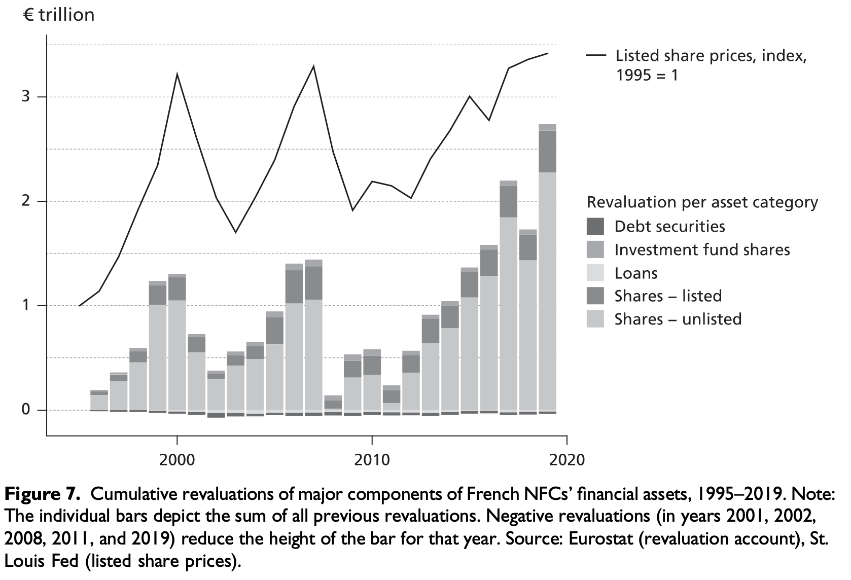 Cumulative revaluations of major components of French NFCs’ financial assets, 1995–2019
