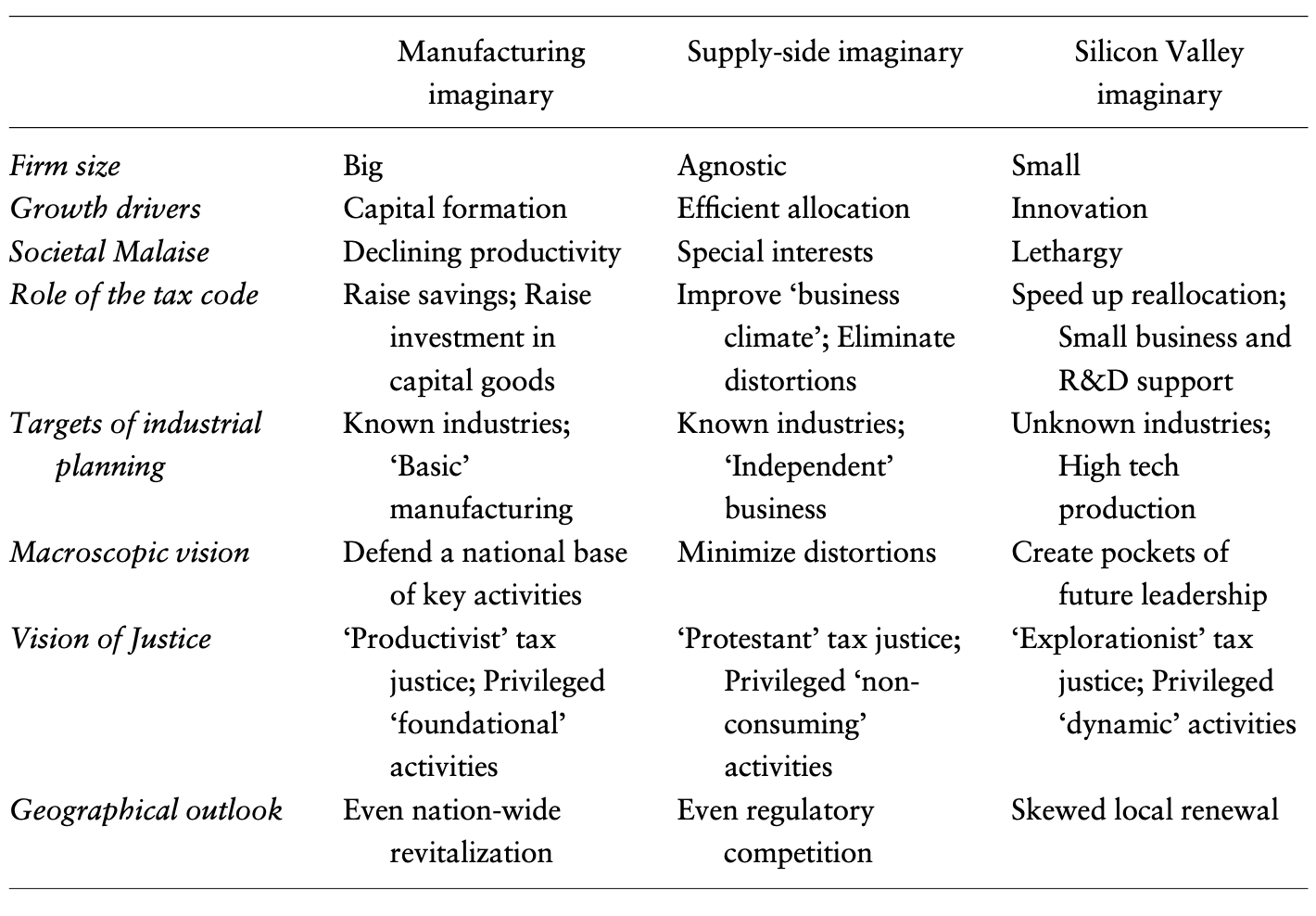 How do policy paradigms change? This article demonstrates that changing social imaginaries about economic growth enabled paradigmatic changes in USA corporate tax policy in the 1980s. Based on archival sources, it reconstructs how policy makers switched from focused support for capital-intensive smoke-stack industries towards support for emerging high tech-sectors between two major tax-bills in 1981 and 1986. This switch was made possible by the emergence of what we call the Silicon Valley imaginary—the idea that sound economic policies stimulate the reallocation of society’s resources towards new economic fields. The emergence of this social imaginary resulted from political realignments and changing notions of economic growth and justice. The search for sources of future economic growth and societal coalitions led policy-makers to appropriate ideas about the promises of new industries.